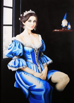 « Cette série sur des personnages féminins se compose de 2 parties, la première qui est un parrallèle entre le regard animal et humain, chacun opposé dans la toile et une seconde série où je rends hommage aux maîtres de la peinture classique, en particulier à la rigueur et à l’élégance des portraits de Jean-Auguste-Dominique Ingres ou John Singer Sargent. Sous un réalisme poussé, les figures féminines en costumes d’époque sont la toile de fond d’une narration comique.