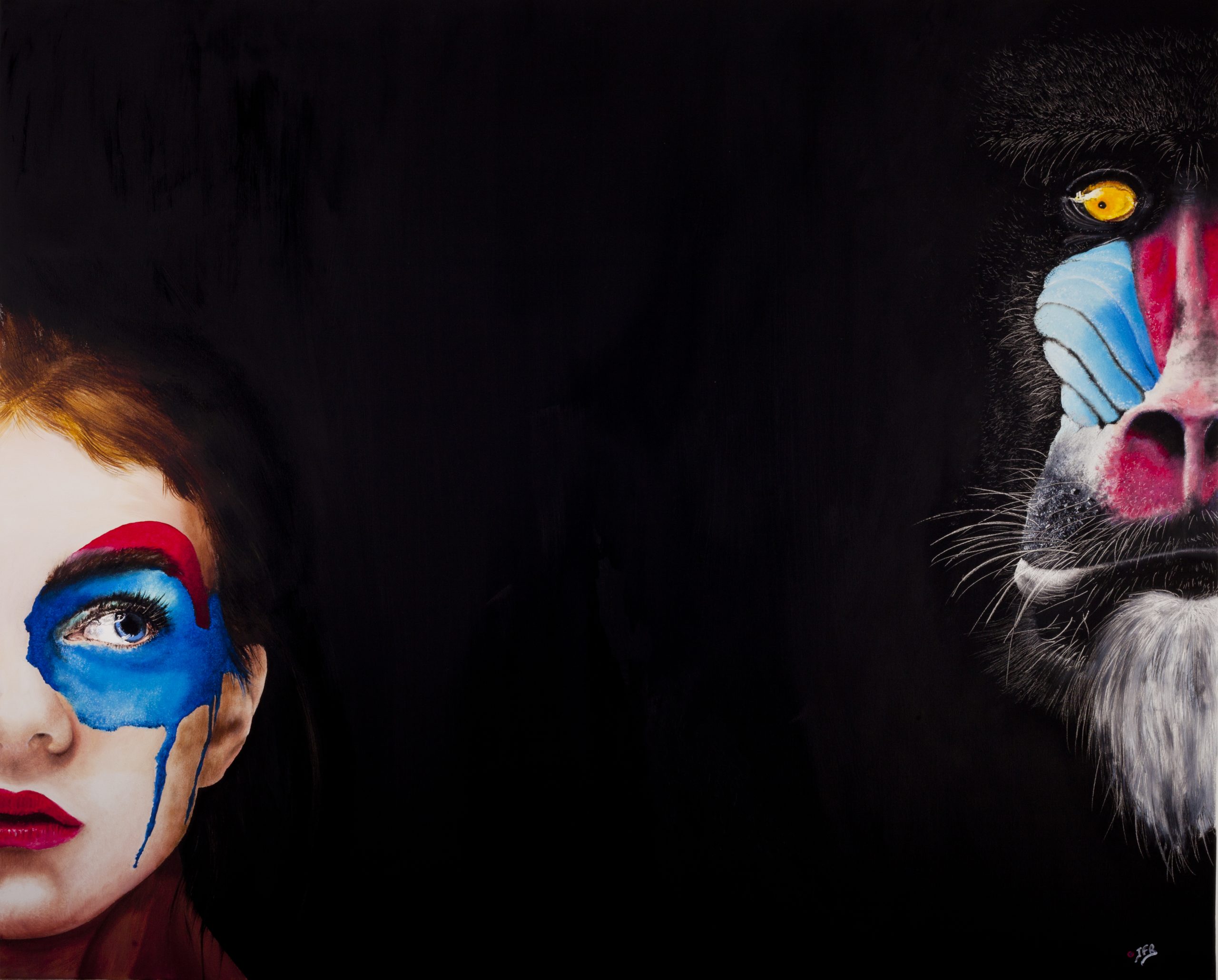 « Cette série sur des personnages féminins se compose de 2 parties, la première qui est un parrallèle entre le regard animal et humain, chacun opposé dans la toile et une seconde série où je rends hommage aux maîtres de la peinture classique, en particulier à la rigueur et à l’élégance des portraits de Jean-Auguste-Dominique Ingres ou John Singer Sargent. Sous un réalisme poussé, les figures féminines en costumes d’époque sont la toile de fond d’une narration comique.