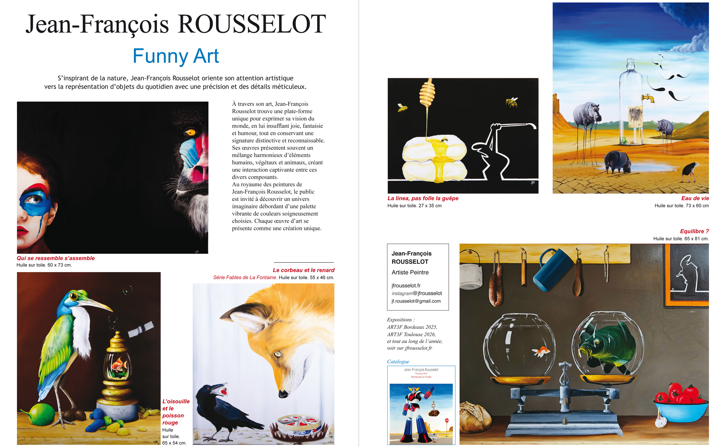 Artiste toulousain passionné et autodidacte, Jean-François Rousselot donne vie à un univers vibrant où humour, hyperréalisme et imagination se rencontrent.